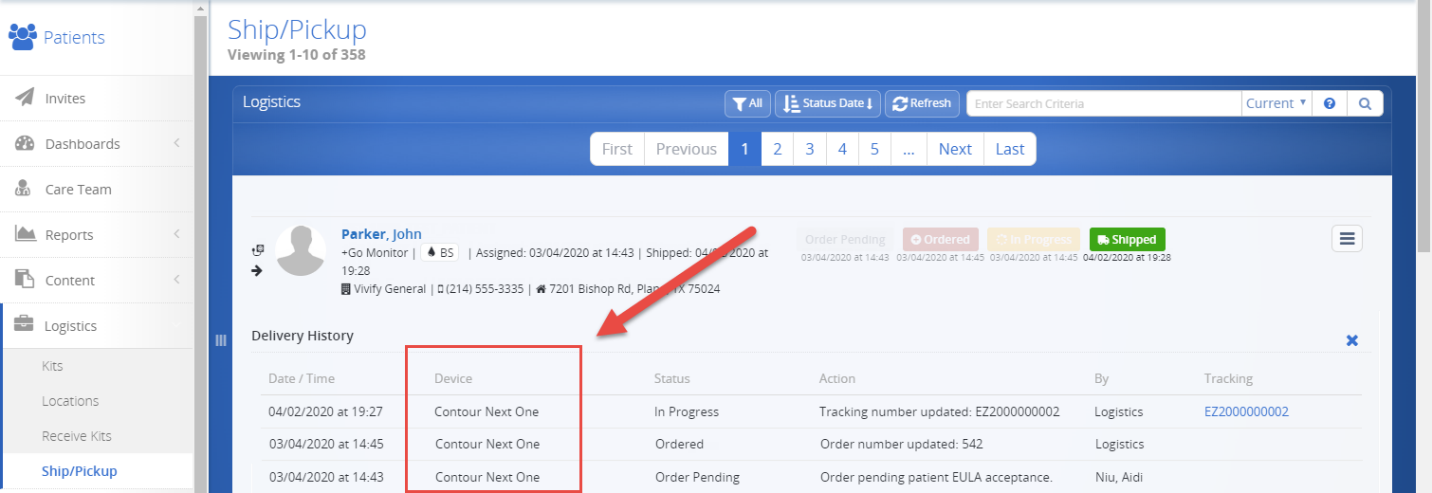 Device replacement delivery history is visible in the Care Team Portal on the Ship/Pickup page, so the team can follow the progress of the patient receiving their device. The statuses, actions, tracking numbers, dates, and other details sync from the Logistics Portal to the Care Team Portal.