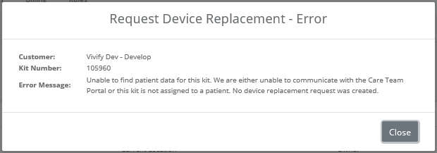 Kit device replacement records are not created if the system can't find patient data from the Care Team Portal. If a user attempts to replace a device that is not assigned to a patient, or the Logistics Portal cannot communicate with the Care Team Portal, the system displays an error message.