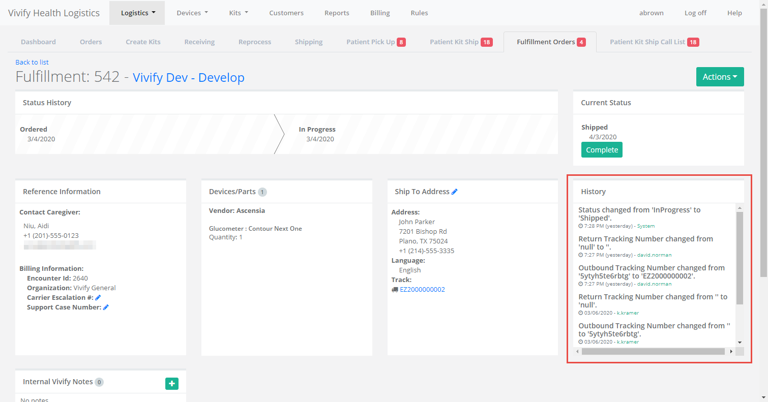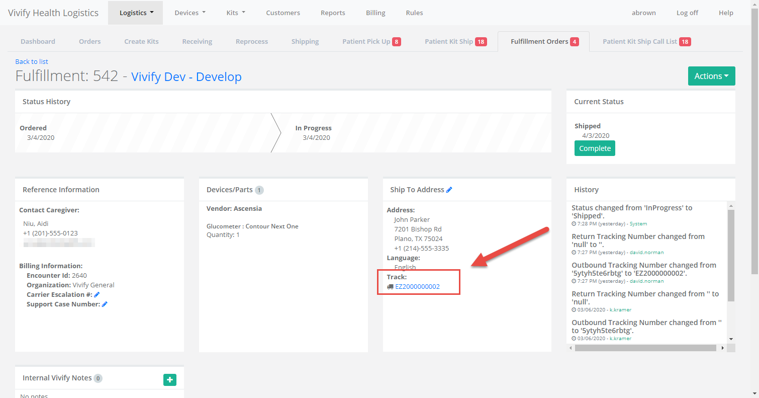 Outbound and return tracking numbers are visible for device fulfillment orders for each device in the record. Any updates to the tracking numbers in the Logistics Portal will update the tracking numbers in the Care Team Portal. |
