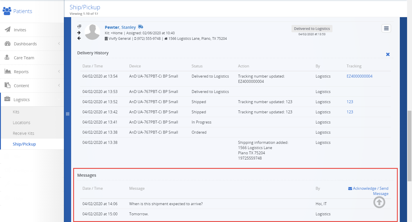 Kit device replacement records now include messaging between the portals. The Logistics Portal Operations team and the Care Team Portal team can send messages related to records and status of replacement. |