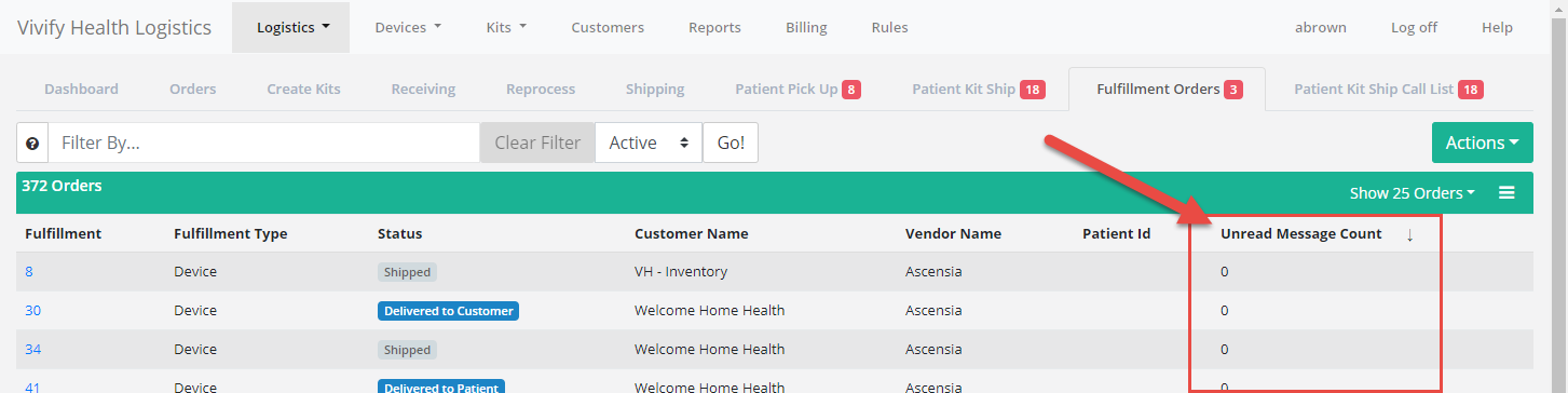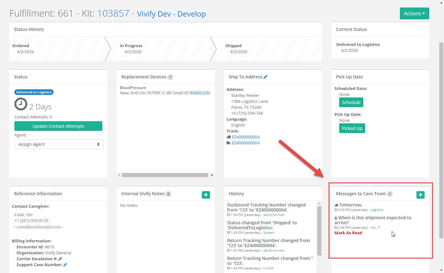Kit device replacement records now include the ability to send messages between the portals. The Operations team and the Care Team Portal team can send messages related to records and status of replacement (see and ). When a message is sent from the Care Team Portal to the Logistics Portal, the unread message counts on the Fulfillment table and on the Fulfillment tab are incremented (see ).