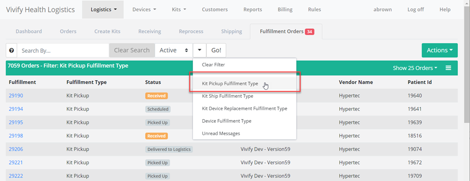 Note: The previous Patient Kit Pickup page was removed from the Logistics menu as this data is now on the Fulfillment Orders List page.