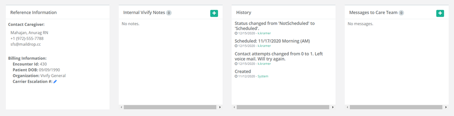 - Reference Information: Includes Contact Caregiver and Billing Information (Encounter ID, Patient DOB, Organization, Carrier Escalation).
