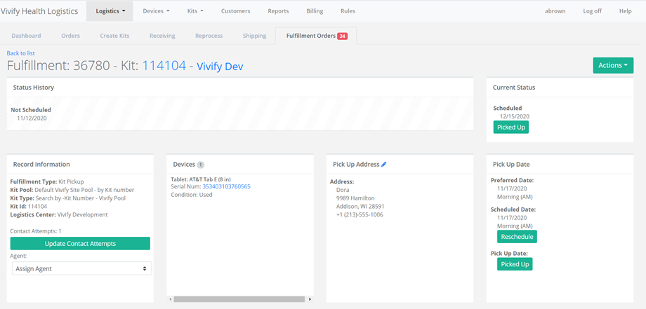 The Kit Pickup fulfillment type is available on the Fulfillment Orders page in the Logistics Portal. When a pickup order is received from the Care Team Portal, the order is saved to the Fulfillment Orders page.
