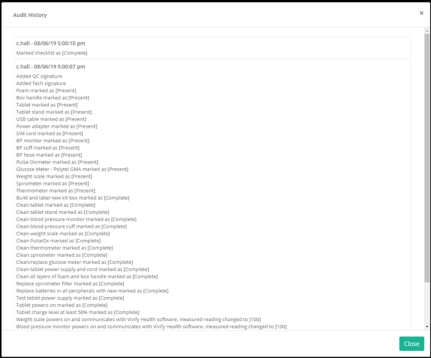 The Kit Reprocessing Checklist enables the Logistics team to track each component of the kit and record its status. After each component is accounted for, the reprocessing actions can be performed, and then the checklist is signed by the logistics technician and the quality control technician. Each checklist has an Audit History feature that includes all the actions taken and who performed them. With the checklist, the team can also mark a device as replaced, which will help keep track of device locations during kit reprocessing. For example, if a device or a component has physical damage, the status will appear on the checklist.